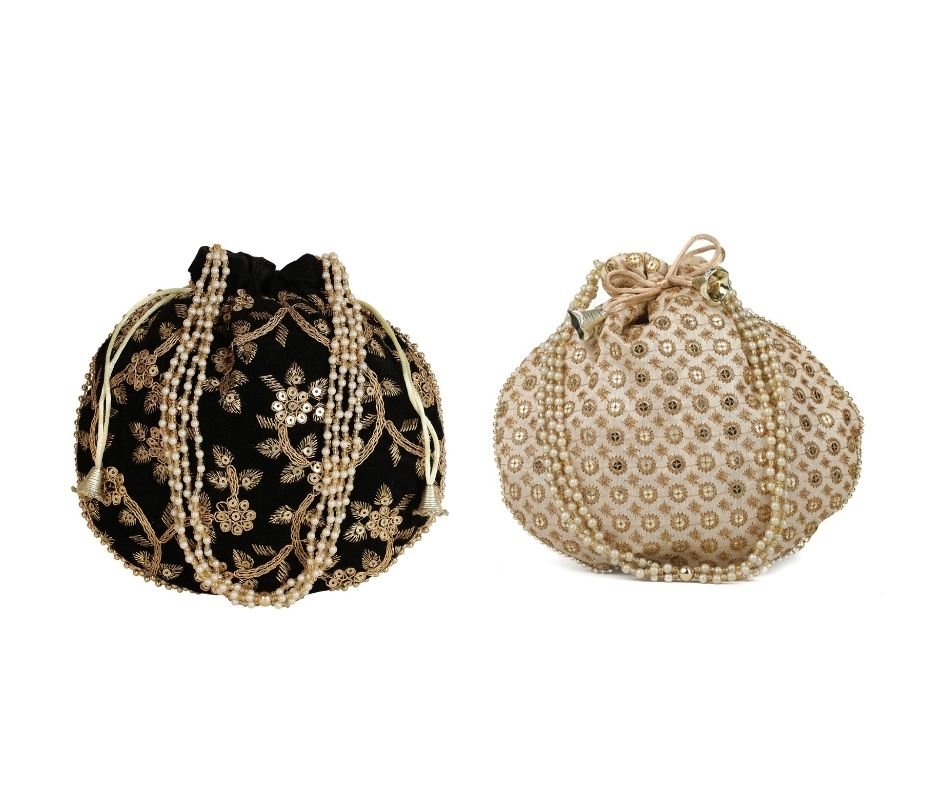 This product is a combo of tow Embellished potli bags having wrist loop 1 main compartment each with drawstring closure. Size & Fit Size of each potli bag : 9 x 9 x 3 Inch (Length x Width x Depth ) Material & Care Fabric Wipe with clean, dry cloth