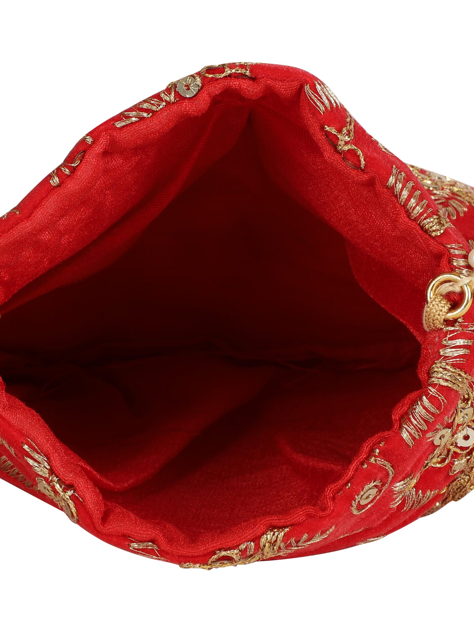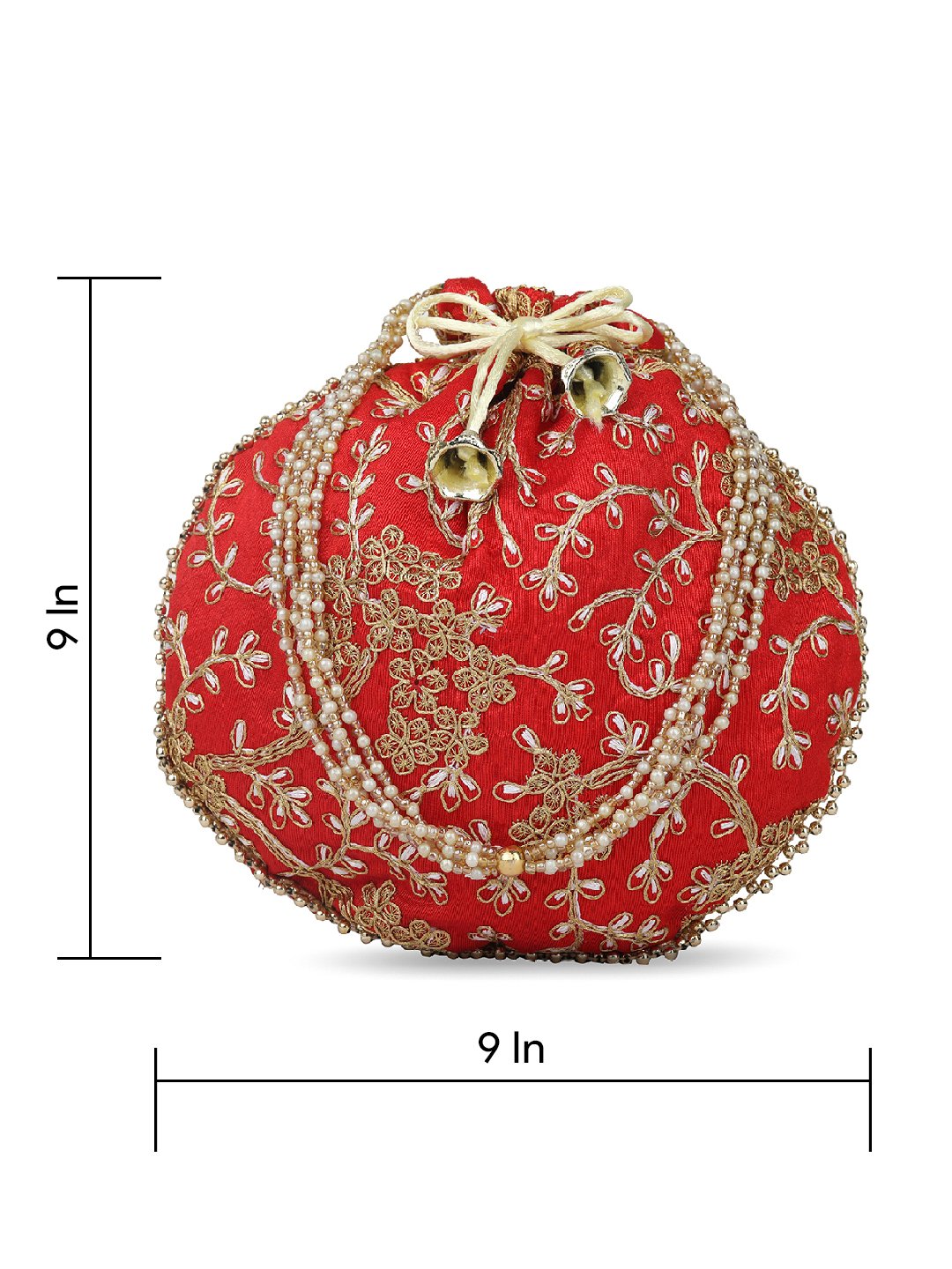Red and gold-toned embellished potli clutches Has wrist loop 1 main compartment with drawstring closure Size & Fit Height: 18