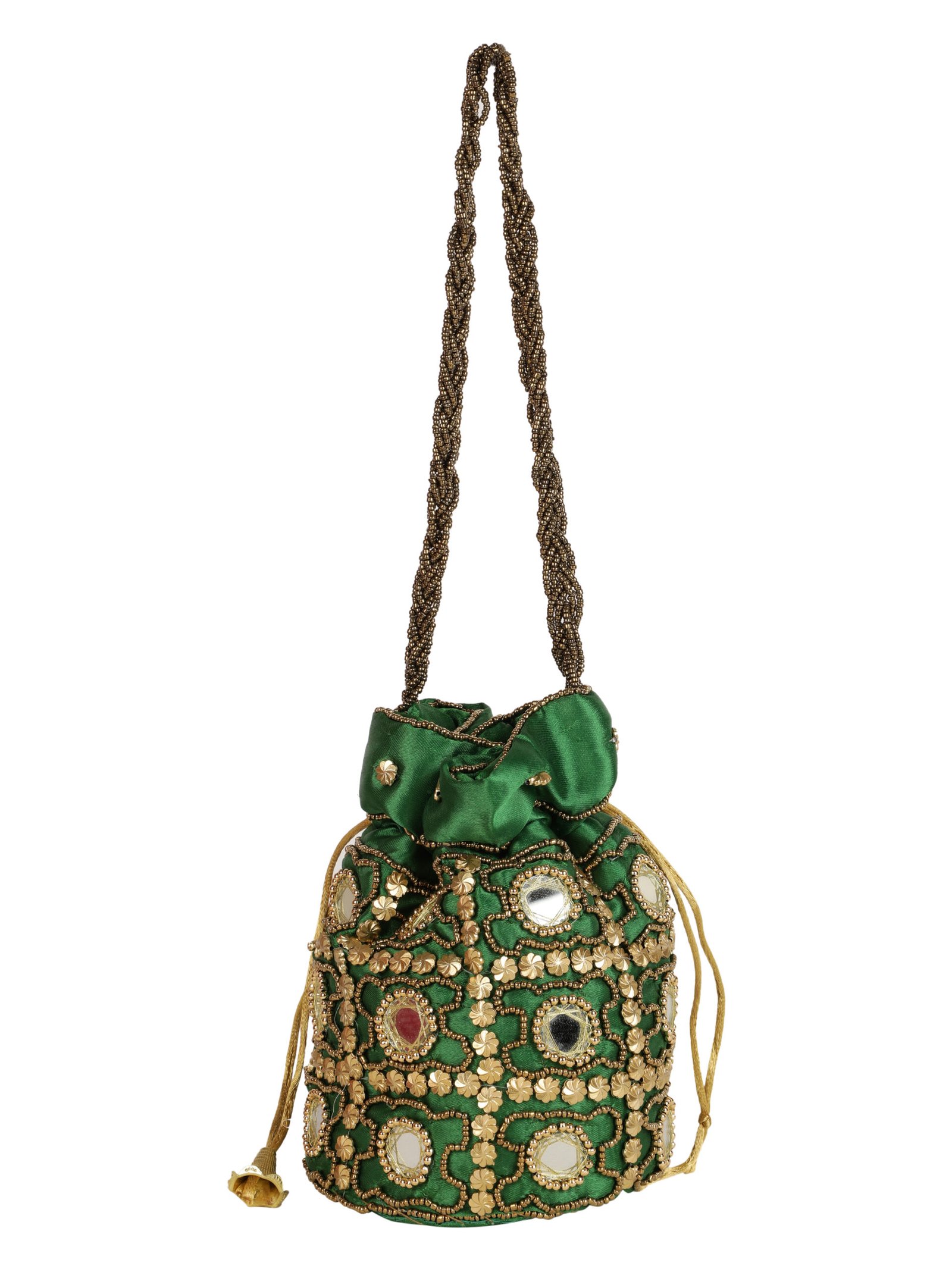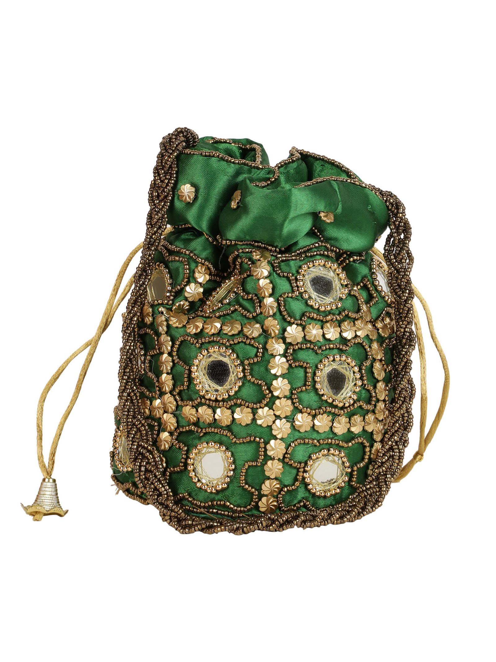 Green and gold-toned embellished potli clutches Has wrist loop 1 main compartment with drawstring closure Size & Fit 18 x 2 x 10 cm Material & Care Wipe with clean, dry cloth