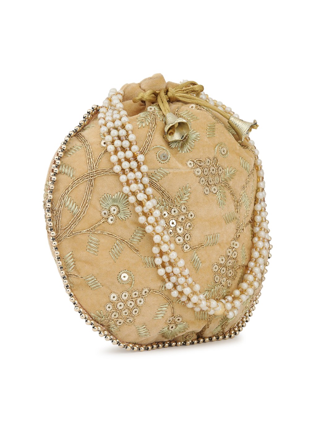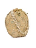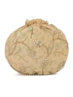 Beige and white embellished potli clutches Has wrist loop 1 main compartment with drawstring closure Size & Fit Height: 22 cm Width: 22 cm Depth: 7.62 cm Material & Care Fabric Wipe with clean, dry cloth